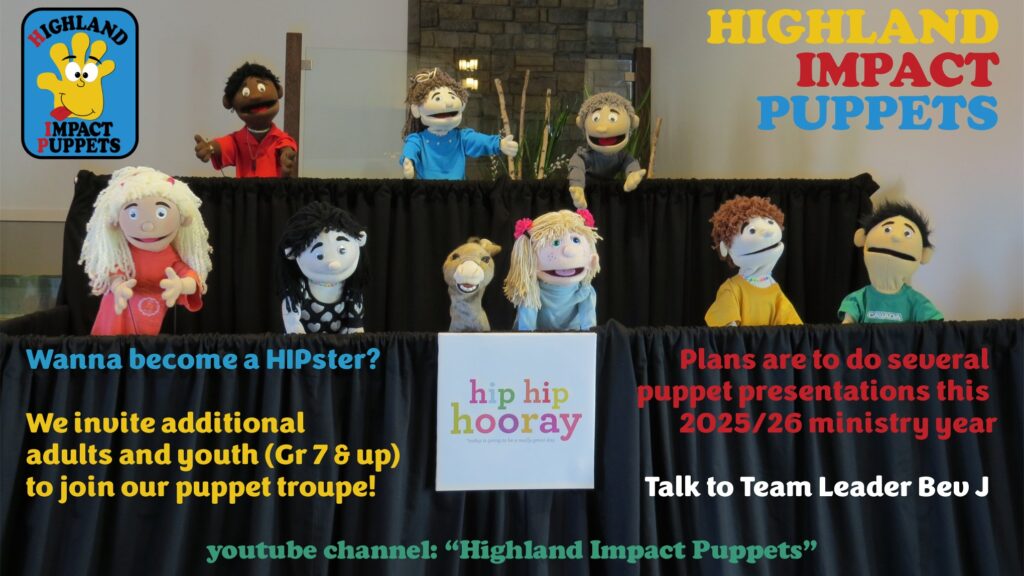 Here are links to the Highland Impact Puppets’ YouTube channel and the latest H.I.P. skit – Waiting On The Lord – recorded in May 2025: